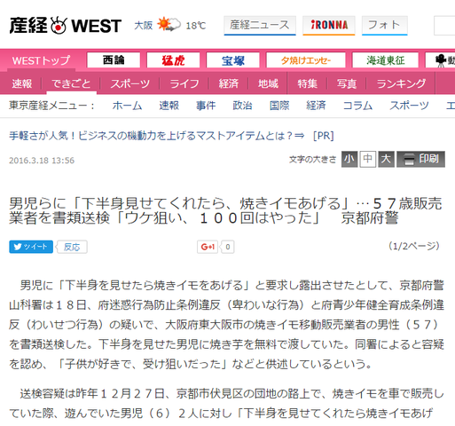 大阪府在住のこの男性、クルマを使って京都以外にも出没し、このような犯行を「10年ぐらい前から」「100回ぐらいやった」らしい。そして「子供が好き」「子供は下品なことをいうとウケるので」という思いから始めたものがエスカレートしていったという。中年の下ネタの“ダシ”にされた焼きイモが不憫で仕方ない。