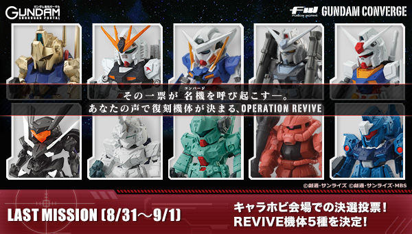 人気の食玩「FW GUNDAM CONVERGE(フュージョンワークス ガンダムコンバージ)」シリーズに登場する68種の機体の中から“復刻して欲しい機体”を投票、その結果から「5種」を復刻=REVIVE。さらにシリーズ未立体化の新規機体1種を加えた特別セットとして発売する投票企画「FW GUNDAM CONVERGE OPERATION REVIVE(フュージョンワークス ガンダムコンバージ オペレーションリバイブ)」の最終決戦進出機体10種が発表された。