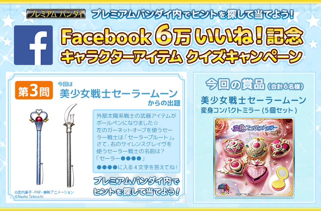 本キャンペーンはプレミアムバンダイFacebookページが昨年末に6万いいね!に到達したことを記念してFacebookから人気のキャラクターアイテムにまつわるクイズに答えると豪華賞品が当たるキャンペーンだ。今回の第3弾は『美少女戦士セーラームーン』からの出題となり、正解された方の中から抽選で6名様に『美少女戦士セーラームーン』の大人気アイテム、ガシャポンの「変身コンパクトミラー(5個セット)」が当たる。第3弾の応募期間は2014年2月28日(金)10時59分まで!
