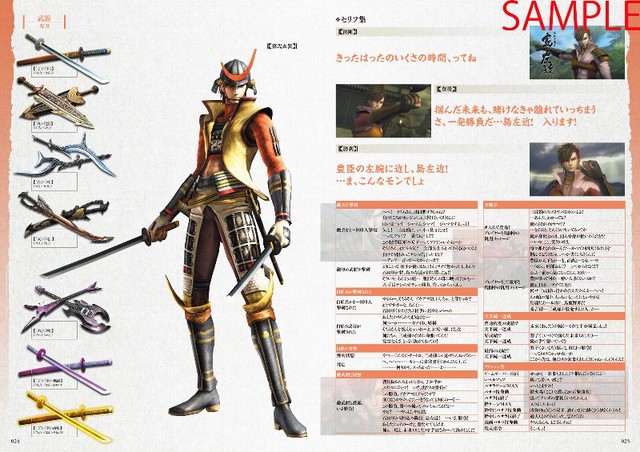 武将ページには、武将CG・墨絵のほかにも、武器CG、第二衣装CG、さらには珠玉のセリフ集も収録。ダウンロードコンテンツ特別衣装ページの貴重な三面図にも注目してほしい!