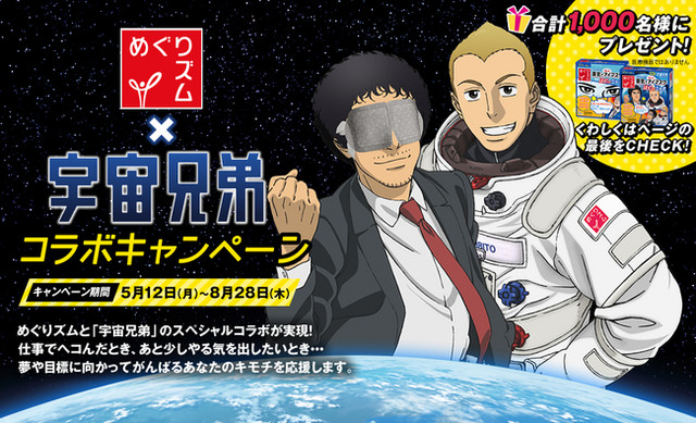 『宇宙兄弟』が花王の「めぐりズム蒸気でホットアイマスク」とコラボ。宇宙兄弟の2人が出演するコラボCMが5月15日より全国で放映開始。キャンペーンサイトもOPENした。コラボキャンペーンサイトで新CMも観られる。