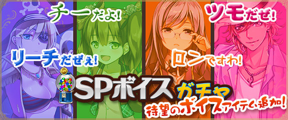 『セガNET麻雀 MJ』に2014年9月2日(火)、新アイテム「SPボイス」が当たる「SPボイスガチャ」がオープン。キャラボイスが対局を盛り上げる。同日には「新キャラ限定 SPキャラガチャ」の内容も更新。新たに8人の新キャラがラインナップされた!