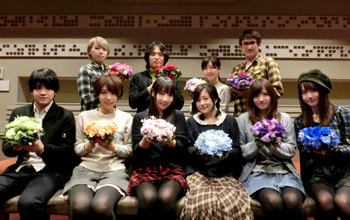 写真(前列左から)石川界人さん、豊崎愛生さん、夏川椎菜さん、水瀬いのりさん、佳村はるかさん、小松未可子さん (後列左から)東内マリ子さん、追井政行監督、茅野愛衣さん、土田大さん