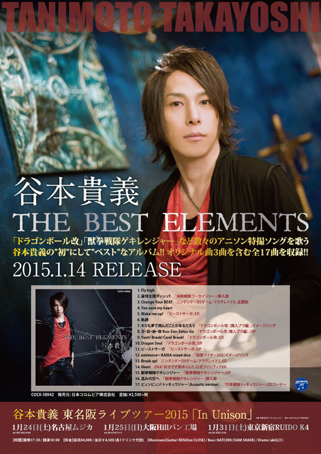 「ドラゴンボール改」、「金色のガッシュベル!」「獣拳戦隊ゲキレンジャー」等でおなじみのアニメ/特撮ソングソングシンガー、谷本貴義の東名阪ライブツアーが1月下旬からスタート!!デビュー13年目にして、ヒット曲を満載の初のアルバム『THE BEST ELEMENTS』を手にした、レコ発ライブツアーとなる。