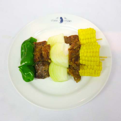 TVアニメ8話でみんなで食べたバーベキューをイメージ。とうもろこし・肉・たまねぎ・肉・ピーマンという8話と同じラインナップです!美味しく焼きあげて、キュアメイド特製のピリ辛バーベキューソースをお掛けしてご提供いたします。コンゴウのようにひとくちで残さず、ピーマンも食べてくださいね♪