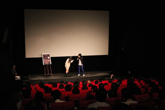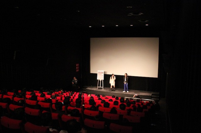 開始時刻となり、先程入場した今井と祁答院が最前列の座席より登壇。サプライズ入場の話に始まり、「今井さんポップコーン食べ過ぎじゃないですか!?」といった祁答院のツッコミや今井の「お化粧や髪型まで整えてもらってこんなにきちんとした状態で映画を観るのははじめて!」という話を交え、アットホームな雰囲気で進行。その中で今井は今回のイベントが行われたきっかけを「実は今まで映画館で観る機会がなく、どうしても映画館で観たい!ということで企画を持ちかけてみたら実現した」と語った。