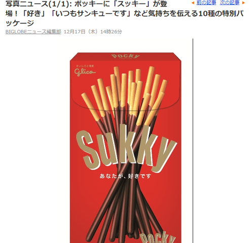 元記事によれば江崎グリコが、イベントの多い1月~3月に向けて様々なメッセージを商品名に込めた「Sukky(スッキー)」や「Giricky(ギリッキ―)」などの特別パッケージを12月29日(火)より販売するとのこと。『ポッキー』『ポッキー 極細』『ポッキー つぶつぶいちご』など5種類で合計10のパッケージが用意される。詳しくは下記を参照してほしい。