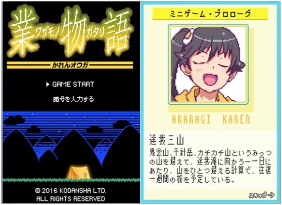 今回の8bitゲーム『業物語』は、シリーズ最新刊『業物語』に収録の一篇「かれんオウガ」にちなんだもの。「かれんオウガ」は、暦の妹・阿良々木火憐が修行の旅に出るところからはじまる。8bitゲーム『業物語』では、「かれんオウガ」の世界の中で火憐を操る8bitの横スクロールゲームや、<物語>シリーズのキャラクターが8bitで登場し、原作文章にちなんだクイズを出題するMAP上を冒険できるサイトとなっている。