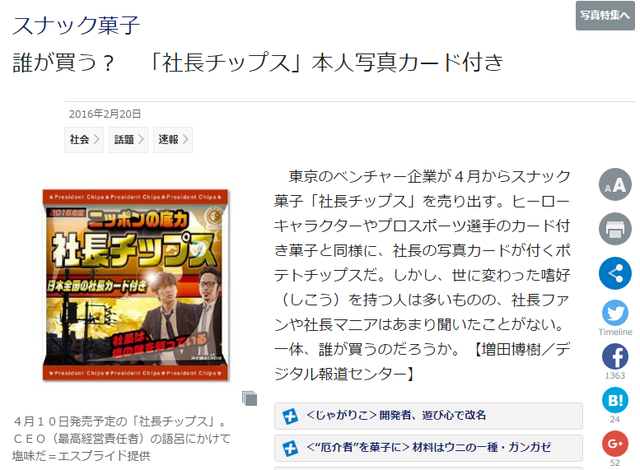 誰が買う? 「社長チップス」本人写真カード付き(毎日新聞)