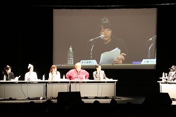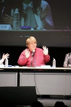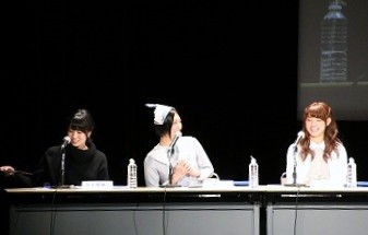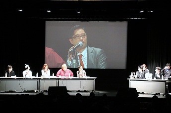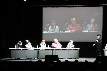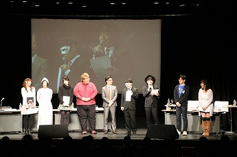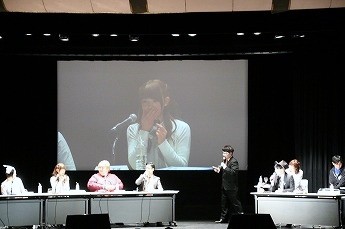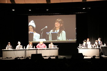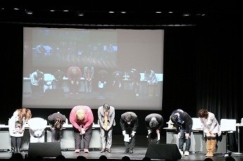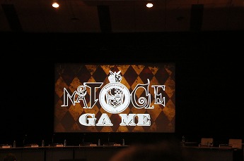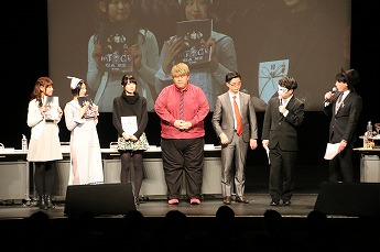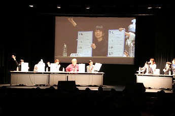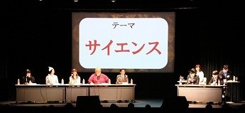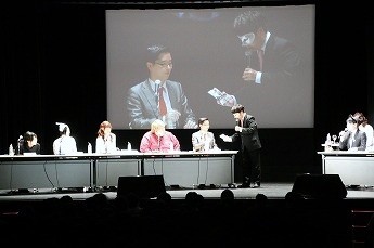 ■プレイヤーたちの様子を眺めるためのVIP席。ここには解説を務める、東京大学大学院でゲーム理論を勉強しているというタレントの夏海紫(なつみ ゆかり)さん(後列左)、ジャッジのハガキ職人(ラジオや雑誌に投稿する人)・哲ひとさん(後列右)も座ります。NATURE GAME時代にはプレイヤーとして出場していた哲ひとさん、今回は会場の規模が広がったということでなんとメイクも受けたそうです。