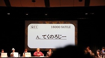 そしてQ11の「科学は英語でScienceですが、技術は英語で?」という問題。安藤さん、一木さんが「Technology」と答える中、青木さんが「てくのろじー」と平仮名で回答。そしてスクリーンに映る回答は「てくのろじー」。青木さんだけが正解、16000NATCLE獲得という結果に。