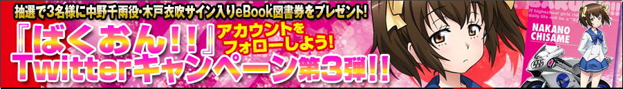 アニメ『ばくおん!!』公式&ばくおん!!ぽーたる@ebjのTwitterをフォロー&専用フォームから応募してくれた方の中から抽選で3名様に、中野千雨役・木戸衣吹さんサイン入りeBook図書券をプレゼント。