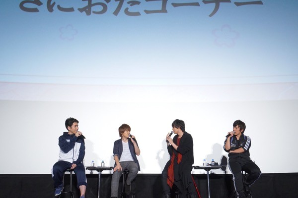 本作の感想をたっぷりと伺った後、キャスト4名による生アフレココーナーへと移りました。第一話の本編映像にあわせ、キャスト陣が刀剣男士たちを熱演。アドリブを交えつつの楽しい演技を披露し、会場を魅了しました。