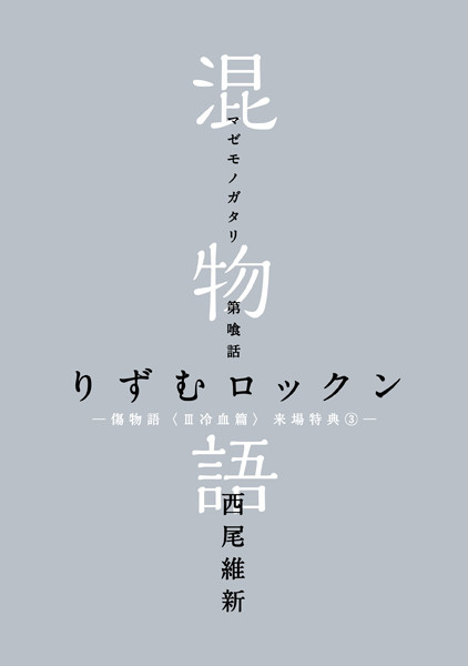 今回、第一部、第二部にて大好評であり、第三部『傷物語〈Ⅲ冷血篇〉』においてもファンの方々に待ち望まれている劇場来場者プレゼントである西尾維新書き下ろし小説「混物語」より、第三週目・第喰話「りずむロックン」の配布が決定。今回は北白蛇神社を舞台に「戯言シリーズ」より匂宮理澄が登場する。