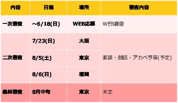 二次審査/7月23日(日)大阪、8月5日(土)東京、8月6日(日)福岡