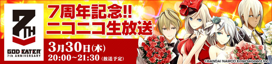 株式会社バンダイナムコエンターテインメントは『GOD EATER(ゴッドイーター)』が2017年2月4日に7周年を迎えたことを記念した、ニコニコ生放送を2017年3月30日(木)に実施することを決定した。シリーズ7周年を記念した様々な取り組みの発表や、『ゴッドイーター オンライン』のゲーム紹介、新情報も公開する予定。なおタイムシフト予約も可能だ。