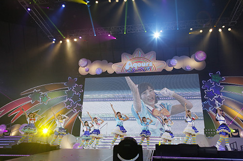まずは知らない人のためにAqoursについて紹介しておくと、彼女らはスクールアイドルプロジェクト『ラブライブ!サンシャイン!!』に登場する9人組のスクールアイドルグループで、初となる今回のワンマンライブには高海千歌役の伊波杏樹さん、桜内梨子役の逢田梨香子さん、松浦果南役の諏訪ななかさん、黒澤ダイヤ役の小宮有紗さん、渡辺 曜役の斉藤朱夏さん、津島善子役の小林愛香さん、国木田花丸役の高槻かなこさん、小原鞠莉役の鈴木愛奈さん、黒澤ルビィ役の降幡 愛さんの9人が出演。今回のライブでも圧倒的なパフォーマンスを見せ付けてくれた。