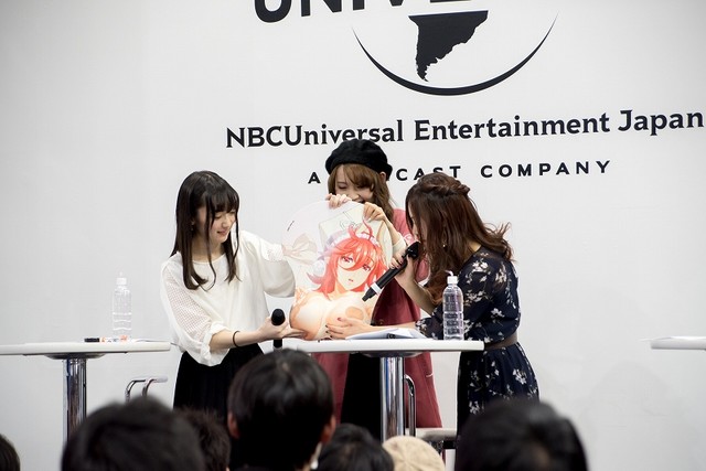 バストの画像を見てどのキャラクターかを当てるクイズ「キャラクター当てクイズπr2」も、実にこの作品らしい企画となりました。キャラクターのバストトップが『sin 七つの大罪』の丸い番組ロゴで隠されただけのおっ●いどアップ画像が巨大スクリーンに次々と写し出されると、思わずブースの外の通行人が足を止めるほど。クイズとしても、肌色の違いで判断できるものは簡単なほうで、谷間のラインの違いから当てるしかない難問には出演者も相当頭を悩ませていました。