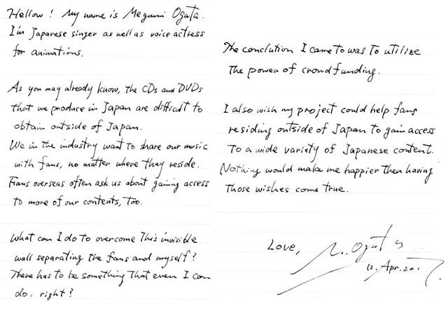 緒方さんはクラウドファンディングを使用した理由について、「海外のファンに正規品を日本のファンと同時にお届けしたい」「海外のみなさんにも、日本のみなさんにも、私達が置かれている現状を知って貰いたかったから。」というものを挙げている。