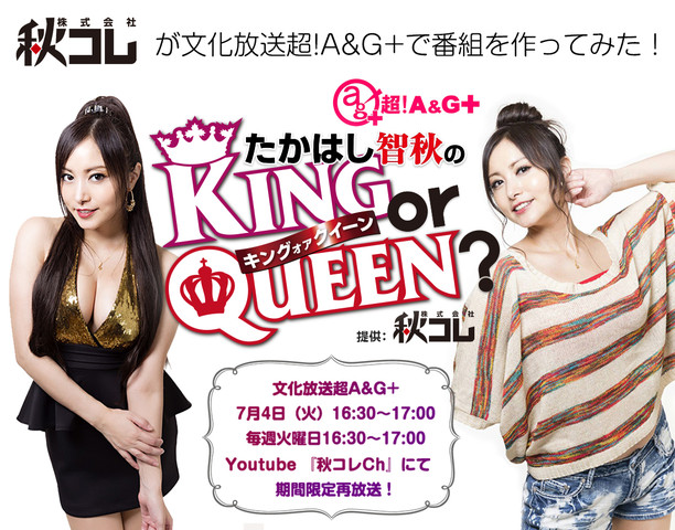 文化放送 超!A&G+にて7月4日(火)16:30〜17:00に新番組『たかはし智秋のKING or QUEEN?』がスタートした。たかはし智秋がリスナーのお悩みに答えたり、平日夕方からの放送にもかかわらず、1・9・8(イクわ)の文字数でセクシー川柳を披露したり(?)、自身の顔だという豊満な胸に色々なものをはさんだり(!?)と見所満載な30分番組だ。