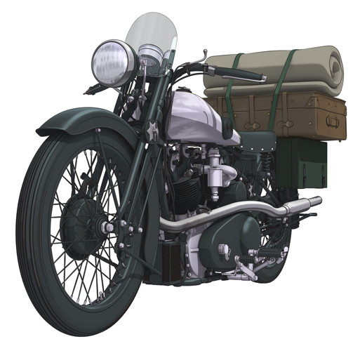 田口:キノとエルメスって、仲間というのにも友達というのにも形容しがたい気がして…。相棒的な感じがするんですよね。どちらが欠けても成立しないような気がするので、この二人の関係性を、密に表現したいと思いました。エルメスのCGに関しては、ものすごいこだわっています(笑)。エルメスって、ブラフ・シューペリア SS100という実車がモデルになっているんですけど、そのモデリングを作るにあたって、相当細かいところまで解析して作り込んでいるんです。アニメだとセルルックに落とし込んでいるので細かい部分はわかりづらいのですが、それを外したときのエルメスのリアリティはかなり高くなっています。実写で使われる3DCGくらい作り込んでいるので、ある意味前代未聞のバイクアニメになっている気がします(笑)。
