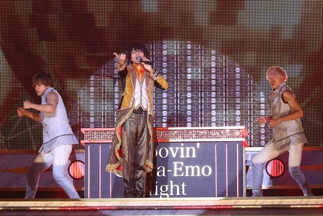 1曲目はシンとルヰで歌唱された劇中歌「BOY MEETS GIRL」のイントロとともに各キャラクターをイメージした衣装を身に着けたエーデルローズ新入生の7名が登場。会場のボルテージは一気にあがり、そのままソロ曲を次々に披露。ソロパート最後は「EZ DO DANCE -THUNDER STORM ver.- 」を本編さながらキレのあるダンスを踊る武内駿輔が熱唱し、途中、畠中祐も参戦。会場のボルテージが最高潮になったところで、シークレットゲストの高田馬場ジョージのゴーストシンガー役を務めた小林竜之とTheシャッフルが登場し、劇中歌を歌唱。続くOver The Rainbowを務めたキャスト(柿原、前野、増田)のメッセージの後には、ユニットシングル楽曲や新作の主題歌「Vivi℃ Heart Session!」、前作の主題歌「ドラマチックLOVE」でエーデルローズ新入生が再び揃い、息の合ったダンスを魅せました。初の単独ライブは笑顔と感動に包まれた最高のステージとなり、アンコールでは寺島の掛け声に合わせて出演者全員集合。「 Over the Sunshine! 」を全国の応援してくれていたファンのみなさんに届けました。