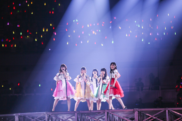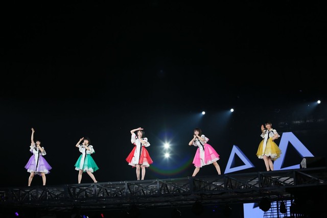 最初のMCで、ワルキューレの2017年の活動を振り返ったあとは幻惑的な新曲「チェンジ!!!!!」へ。主メロを歌っていたかと思えば、いつの間にかコーラスに変わっているという目まぐるしいボーカルワークの歌を、これまた目まぐるしくフォーメーションが変わるダンスをしながら歌う。しかも振り付けは劇場版での迫力のライブシーンを再現しているというのだから圧巻だ。5人が最高のパフォーマンスを繰り広げたあとは「Absolute 5」へ。この曲にある“ひとりでも欠けたら 意味を失ってしまうから”という歌詞が、ここまで走り続けてきた5人の想いや絆を表していると言えるだろう。