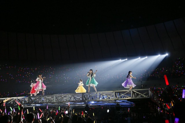 ムーディーな「愛・おぼえていますか」のインスト演奏のあと、衣装チェンジをしてからの後半は、さらに大きな仕掛けが待ち構えていた。「ワルキューレがとまらない」を歌っていると、突如ステージが動き出す。メンバーがパフォーマンスをしたまま、そのステージは、観客席のはるか上空を移動していく。空間を立体的に使った演出はマクロスシリーズならでは。マクロス作品の劇中で繰り広げられるライブは、観客が上空を見上げて熱狂しているシーンが非常に多い。それが現実でも再現されるという驚き。会場の後方まで到達したステージ上で歌われたのは美雲だけでなく、フレイアが2コーラス目のメインを取る「いけないボーダーライン~Album Ver.~」。そして、会場のど真ん中でパフォーマンスした「一度だけの恋なら」、圧倒的な5人のハーモニーが光る「絶対零度θノヴァティック」。「破滅の純情」では、ステージの真下にいる観客に手を振るなど余裕すら感じられた。