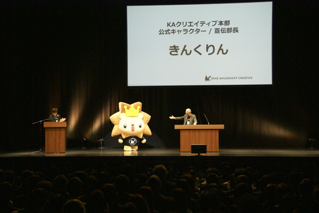 冒頭、キングレコードの専務取締役でKING AMUSEMENT CREATIVEの担当役員、村上氏より挨拶があった後、呼び込まれたのは公式キャラクターの“きんくりん”。可愛らしいポーズと動きで会場を和ませた。