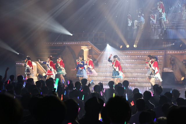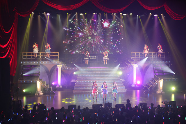 こうして「スタァライトシアター」の終わりと共にゆっくりと赤い幕が落ちていくと拍手のみでライブの余韻に浸っていた客席だったが、まるで魔法が解けたかのように一階席、二階席、三階席の各所から徐々にアンコールの声が沸き上がり、その呼び声は大きなうねりとなって赤い幕で遮られるステージに向けられる! さらにいつしか客席を照らすライトも赤、青、白、水色、緑、黄色、オレンジ、紫、ピンクと変化。こうしてたっぷりと4分間のアンコールに応えて再登場した9人は、カーテンコールにはぴったりな一曲「Glittering star」を披露。そしてラストは先ほど殺陣バージョンで見せてくれた「Star Divine」を殺陣無しの純正バージョンで披露すると、金色のバズーカテープが舞いフィナーレを演出。楽しませるに加えて“魅せる”も意識して作られてた『少女☆歌劇 レヴュースタァライト』の1stライブ『Starry Sky』は大盛況のうちに終了となった。