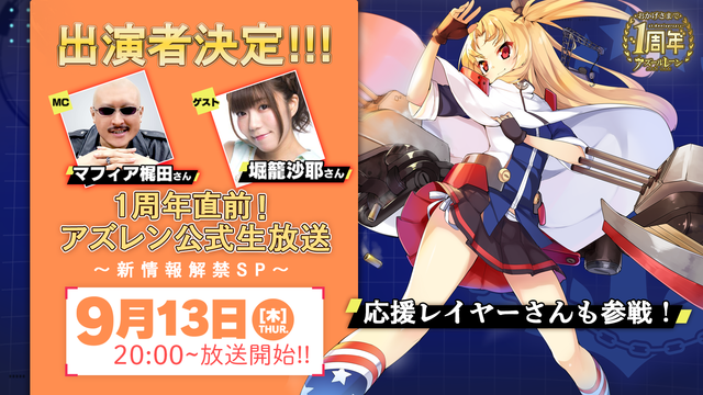 株式会社Yostar(本社:東京都千代田区神田須田町2-8-2プライム神田ビル9階、代表取締役社長:李衡達)は、2018年9月13日(木)に、当社が運営しているスマートフォン向けアプリ『アズールレーン(アズレン)』の1周年直前生放送の出演者を発表した。