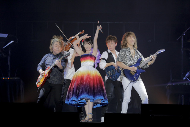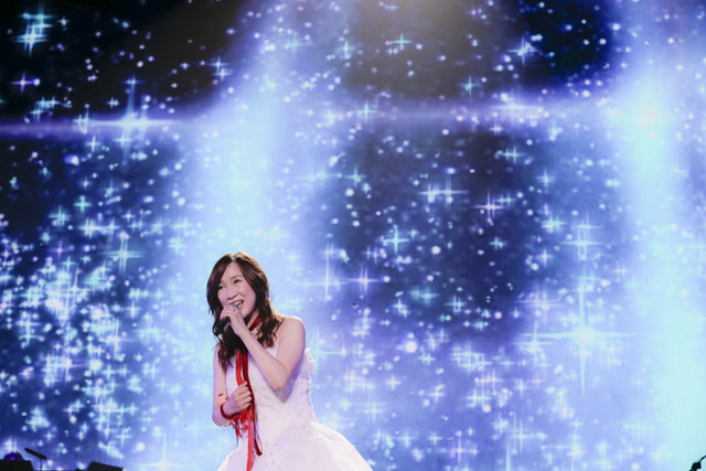 続いて登場したのは、こちらも初の台湾ライブとなる森口博子。会場が青く染まる中、ヒット曲「水の星へ愛をこめて」を歌い、「大家好!(みなさんこんにちは!)」と中国語で挨拶。今年リリースされた新曲「鳥籠の少年」を披露した後は、日本の災害時に台湾からの大きな支援があったことに触れ、「台湾のみなさんに感謝を込めて」と「ETERNAL WIND ~ほほえみは光る風の中~」をたっぷりと思いを込めて歌い上げた。