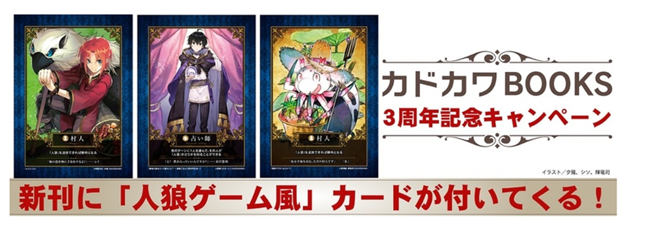 2018年10月から12月まで開催されている「カドカワBOOKS3周年キャンペーン」の対象書籍には初回生産分限定で、“特製「人狼ゲーム風」カード”が付いている。描き下ろしカードの絵柄は1か月につき3種類登場、3か月合計で全9種類が用意されているとのこと。しております。 集めると「人狼ゲーム」を実際に遊ぶことも可能!