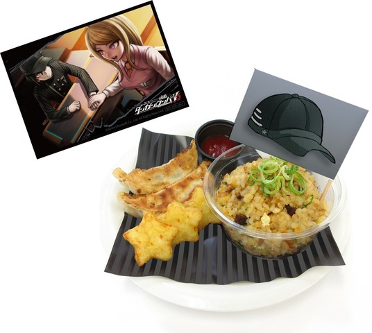 メニュー説明:最原をイメージした炒飯セットです。制服をイメージした敷紙に、餃子や星型のハッシュポテト、帽子がプリントされた旗を飾った。旗を外すと後ろにプリントもなかが隠れているぞ。