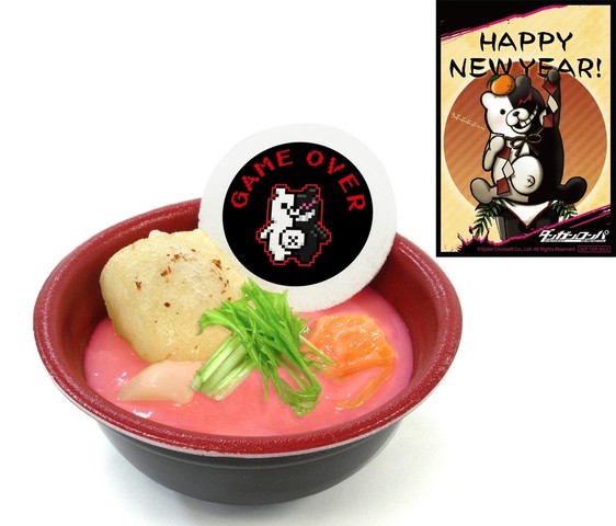 メニュー説明:作品をイメージしたナンジャタウン限定のお正月メニューだ。ピンクに染まったお雑煮は絶望の味…?ぜひ試してみよう。