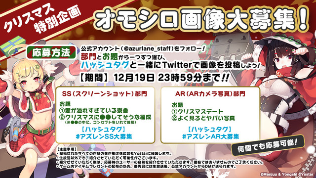 『アズレン』公式Twitterアカウント(@azurlane_staff)をフォローして、お題に沿った画像、もしくは写真を該当のハッシュダグを付けてツイートをしよう。受賞者にはアプリ内のアイテムが報酬として贈られる。(※投稿数に制限はございません。)募集期間は12月19日23時59までだ。