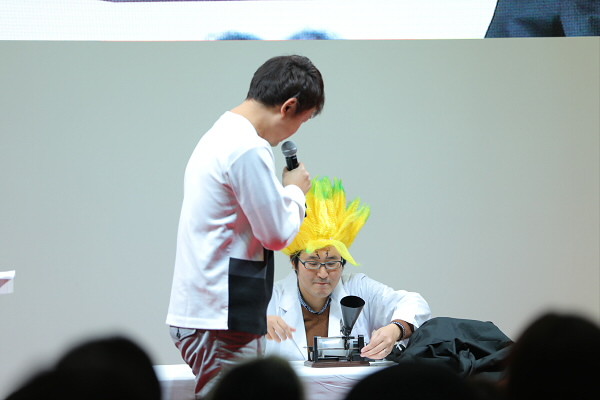 「週刊少年ジャンプ」ブースで最初に行われたステージでは、原作者・稲垣理一郎先生と、千空ふう(?)のかつらをかぶった担当編集者の本田佑行さんがステージに登壇。振り返りコーナーでは、2018年に起こった作品の3大ニュースを発表しました。また、TVアニメの始動について、稲垣先生は「原作の世界観に色が付き、わかりやすくなるのが非常に楽しみです。」と語り、アニメの制作に関して、「原稿用紙が赤の修正でびっしりと埋まるくらい、細かく見ています。原作の世界観をアニメでもきちんと楽しめますので、ぜひ期待してください。」と語りました。さらにステージでは、科学の力を使った「Dr.ほんだの実験コーナー」も行われ、「黒曜石パーライト」による点火実験や、コミックにも登場した「蓄音機」を使い、今後の重大なネタばれを録音するという数々の実験も行われましたが、結果はことごとく失敗。実験不成功となってしましました。