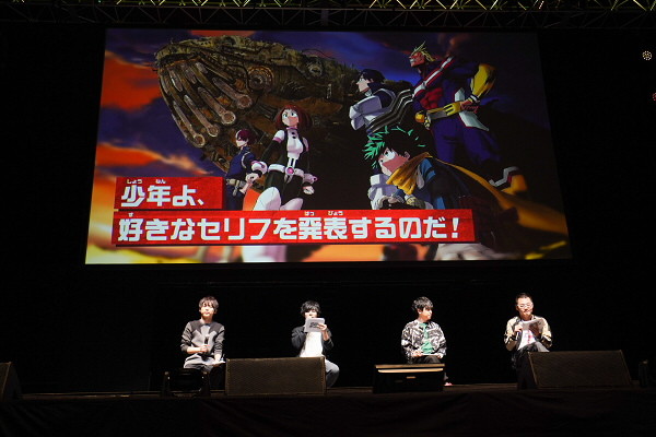 「少年よ、好きなセリフを発表するのだ!」と称したコーナーでは、ツイッターで募集した「ヒロアカの好きなセリフ」の中から、人気が高いセリフをピックアップして発表していきました。原作者・堀越先生の頭の中に「降ってくるように出てきた」という雄英高校の「ビッグ3」通形ミリオの闘いの中でのセリフや、「ずっと描きたくてウズウズしていた」というプロヒーロー・エンデヴァーの戦闘シーンで放たれた印象的なセリフ、アニメでは未登場のプロヒーロー・ホークスのセリフなどが続々ランクイン。