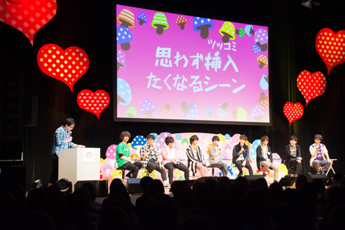 1月27日(日)に、TFT HALL 1000にて、本作のスペシャルイベント「私立モリモーリ学園 ちょっと早めの聖★バレンタインパーティー」が開催され、メインキャストの小林裕介さん(遠野高志役)、濱野大輝さん(加島優役)、村瀬歩さん(矢口恭介役)、熊谷健太郎さん(ジミー役)、佐藤拓也さん(百合絢斗役)、小野友樹さん(田村唯役)、代永翼さん(明美圭一役)、山中真尋さん(糸目幸士郎役)、中澤まさともさん(鹿谷樹役)ら豪華9名のキャストが登壇した。