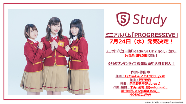 まとめると!●白石晴香・富田美憂・鈴代紗弓による音楽ユニット「Study」、初のミニアルバム「PROGRESSIVE」7月24日発売決定!