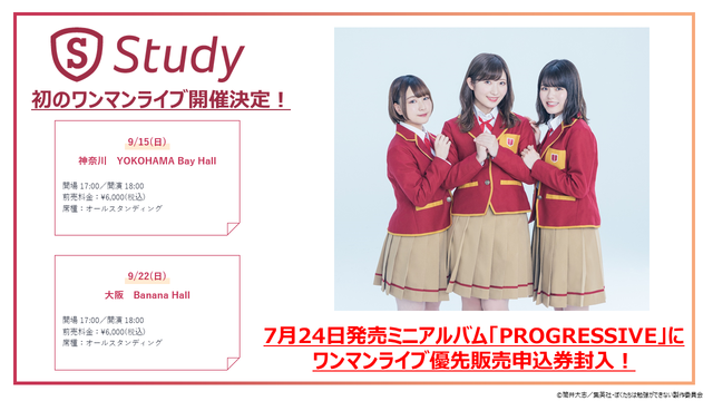 さらに9月15日に神奈川県・YOKOHAMA Bay Hallにて、9月22日には大阪府・Banana HallにてStudy初のワンマンライブを 開催!優先販売申込券はミニアルバム「PROGRESSIVE」に封入。