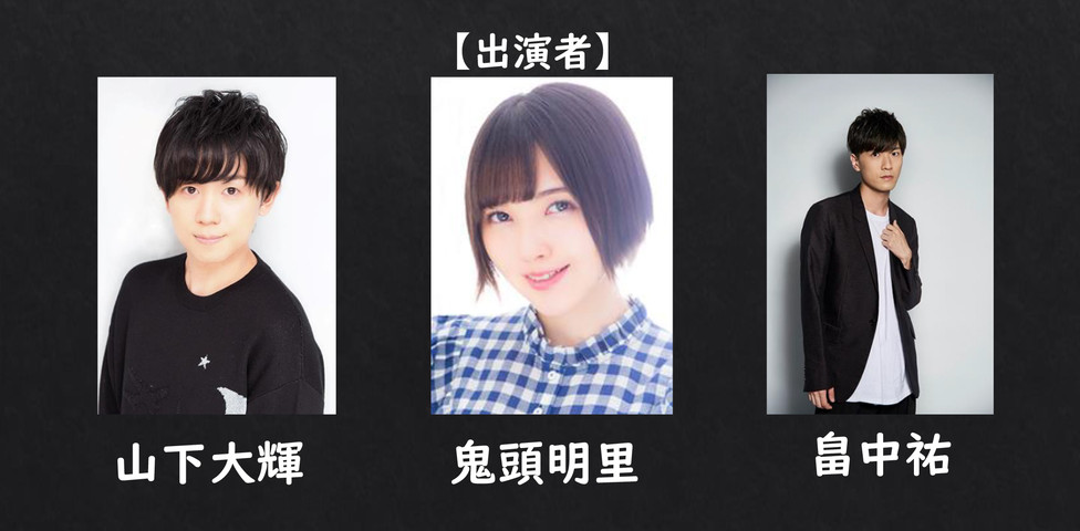 山下大輝さん(入出アカツキ役)、鬼頭明里さん(更屋敷カリン役)、畠中祐さん(駆堂アンヤ役)の3名が登壇。開演時間、チケット販売情報など詳細は続報をお待ちください。