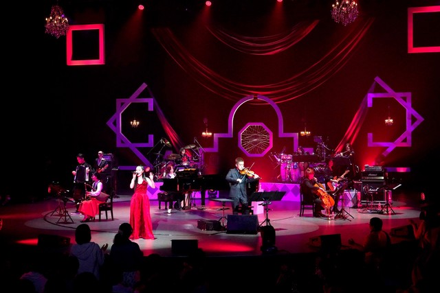 多彩な楽曲の魅力に加え、一流ミュージシャンたちによる演奏もYuki Kajiura LIVEの見どころのひとつ。オープニングでいきなり客席通路に登場した佐藤芳明のアコーディオンや、それに続きステージ最前部で独特の音色を響かせた中原のイーリアンパイプスなど、普段はなじみの薄い楽器の生演奏を堪能させてくれたかと思えば、随所で佐藤強一のドラムと中島のパーカッションが複雑なグルーヴを生み出し、今野のヴァイオリンと赤木のフルートがソロバトルを繰り広げる。中でも各ミュージシャンの熱い演奏が光ったのが、アンコールで披露された『red rose』だ。ワンコードで同一のリフが続く中、佐藤強一と中島がファンキーなビートを奏でる同曲。まずは真っ赤なドレスに身を包んだRemiが客席通路で妖艶なスキャットとダンスで観客の注目を集めると、中島のスリリングなパーカッションソロへ。さらに、中原のイーリアンパイプスソロ、今野のヴァイオリンソロ、佐藤芳明のアコーディオンソロと続き、チェロの西方は二刀流となるトランペットソロを披露。最後は赤木が鬼気迫るアドリブ演奏で締めくくると、総立ちになった聴衆からこの日一番の拍手と歓声が送られた。