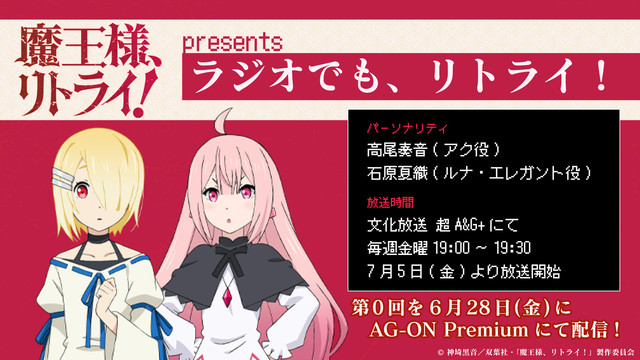 2019年7月3日よりTOKYO MX、BSフジほかにて放送開始の『魔王様、リトライ!』。今回、文化放送・超A&G+にてアク役:高尾奏音とルナ・エレガント役:石原夏織の2人が、TVアニメの魅力をたっぷりお届けするラジオ番組『アニメ「魔王様、リトライ!」presents!ラジオでも、リトライ!』が7月5日(金)19:00~放送が決定。初回放送に先駆けて、第0回を6月28日(金)にAG-ON Premiumにて配信することも決定したぞ。