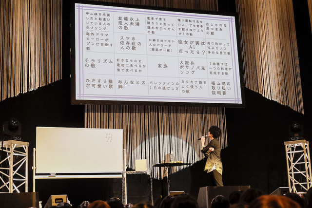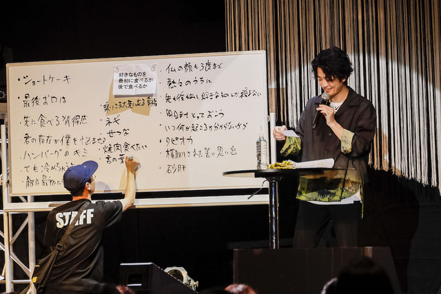 さらにサプライズはこれだけではなかった。続く「みんなで歌詞を作ろうのコーナー」は、今この会場にいるファンから歌詞のフレーズを募集し、それを使って一曲分の歌詞を作ってしまおうという、なんとも大胆で前代未聞な企画。ただしテーマがないとさすがに難しいだろうということで、まずは歌詞全体のテーマを決めることに。20のさまざまなテーマが入ったミュージックボックス(という名の抽選箱)から、無作為に3枚を取り出す福山。そこに書かれていたテーマは、「海外ドラマヒーローがゾンビを倒す歌」、「家族」、「好きなものを最初に食べるか、最後に食べるか」の3つだった。荒唐無稽なテーマに本気で焦る福山の表情に、これがガチ企画だと確信するファンたち。そしてサイリウムを使った観客投票の結果、歌詞のテーマは「好きなものを最初に食べるか、最後に食べるか」に決定する。