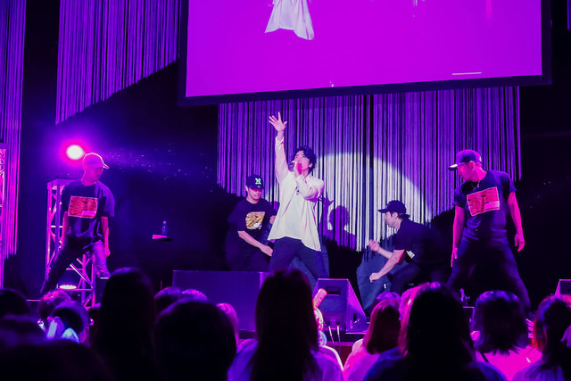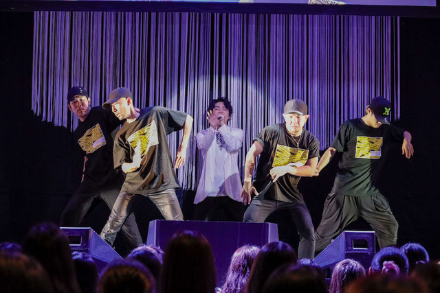 再びダンサーが登場し、ミニライブもいよいよ佳境へ突入。5曲めは満を持しての「dis-communicate」で、ポケットに手を入れてのウォーキングや緩急の付いた振り付けなど、この日いちばんのキレッキレなダンスを披露。そしてそのテンションを保ったまま「KEEP GOING ON!」へ。さらに磨きがかかった福山のラップに加え、バックダンサーによるロボットダンスやヒップホップダンスなど、ソロダンスもフィーチャー。締めくくりは福山を先頭に見事な千手観音ダンスを見せるなど、パフォーマーとしての成長ぶりも伺わせる2曲となった。