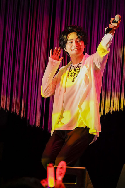 ついにライブタイムが始まった。4人のダンサーを従えてステージに姿を表した福山は、シャツをはだけたラフなスタイルにチェンジ。表情はどこまでもクールで、とても先ほどまでずっと喋りまくっていた人物と同一とは思えない。完全にスイッチが入った状態であることが一目で分かる。最初の曲は「Tightrope」。EDM色の濃い軽快なデジタルロックに会場のボルテージは一気に加速。のっけから激しいダンスと振り付けで熱唱する福山の姿に、アーティストとしての覚悟と進化を感じる。続く2曲めは「OWL」。福山潤の代名詞とも言える、心に深く突き刺さるラップが炸裂。サビではダンサーと息のあったパフォーマンスを披露し、どこまでもカッコいいアーティスト・福山潤をこれでもかと見せつける。