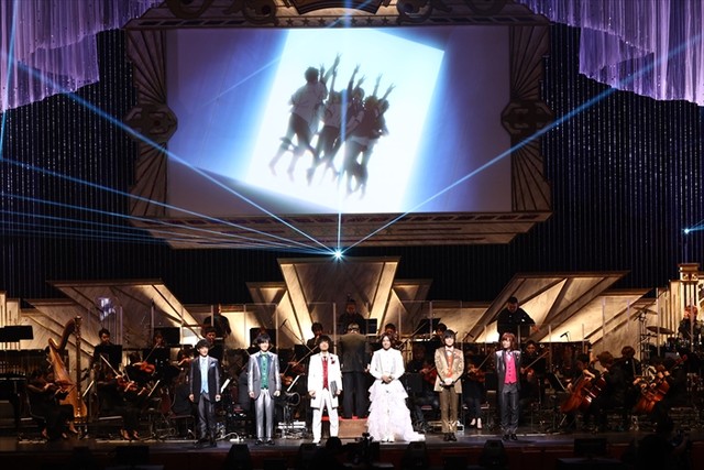 オーケストラLIVEパートの1曲目はTVシリーズの第10話で登場した「MOONSHINE」を蒼井翔太(如月ルヰ役)が歌唱。続く2曲目は如月ルヰのソロショーで使用された「I know Shangri-La」を披露。劇中さながら、切ない表情を浮かべながら歌う蒼井に、感動の拍手が響き渡りました。3曲目はTVシリーズ第11話で一条シン(CV.寺島惇太)のソロショーにシャインが登場した「プラトニックソード」。曲の半ばで、シャイン役を務めた斎賀みつきがサプライズ登場し、寺島惇太とデュエットを披露。寺島と斎賀の力強い歌唱に心を奪われた会場から、割れんばかりの拍手と歓声が起きました。4曲目の「Silent Promise」は本シリーズのゲームアプリに収録された如月ルヰのソロ楽曲。幸せな夢の中で愛する人を想う切ないラブバラードを寺島惇太とのデュエットで歌い上げました。