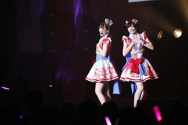 そしてイベントはライブパートへ。まずは三日月眼(ルナティックアイズ)より。『FANATIC』と『トロピカルドリーム』の2曲を、若月美鈴役の岡咲美保と、金剛寺ゆい役の中島由貴がハイテンション系アイドルらしく、キュートなダンスとともに披露。