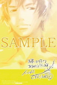 アニメ化企画も進行中の本作の同人誌や特典SS、Web掲載SSなどの番外続篇をまとめた総集篇第2弾が『OFF AIR 2 イエスかノーか半分か』。潮と計の2度目の夜を描いた書き下ろし「恋はあせらず(Love don't come easy)」を始め、現在入手困難な番外篇も一度にたっぷり読める、ファン必携の1冊になった。